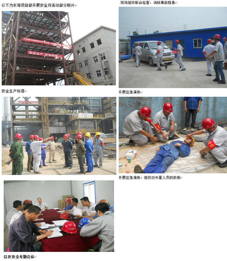 2015年6月期间,我公司开展以“加强安全法治、保障安全生产”为主题的安全月活动。活动以工程总承包项目为主体、“安全第一、预防为主、综合治理”的方针,开展安全培训、安全活动,开设安全讲座等。其中公司东海特钢干熄焦项目部进行了一系列安全活动,第一,建立健全安全管理体系。项目经理带头认真学习国家法律法规、规范标准等文件,贯彻执行安全生产方针,积极组织开展各项安全活动。第二,深入开展事故隐患排查治理行动。项目部组织针对特种作业安全、安全防护用品使用、用电安全、火灾事故隐患及易发高处坠落、物体打击、机械伤害等重点区域进行了专项检查,及时消除事故隐患。第三,开展应急演练活动。项目部针对近期高温气候下施工安全开展“中暑事故应急演练”,对项目应急预案适宜性、应急组织体系有效运行、应急器材设备可靠性等进行了充分的检验,取得了良好的效果。